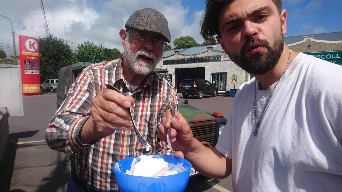Mittags treffen wir uns mit Lucas in Skibbereen an einer Tankstelle. Wir wollen den Tag gemeinsam am Meer verbringen. Andreas kauft ein Eis, weil es gerade so schön sonnig ist. Versehentlich hat er eine Familienpackung erwischt - gut, dass wir unser Campinggeschirr und das Besteck dabei haben, so können wir teilen. An der Tankstelle lernen wir auch Alina kennen, eine junge Lettin, die zum Freundeskreis von Lucas gehört und auf dem Weg zur Arbeit in einem Hotel ist.