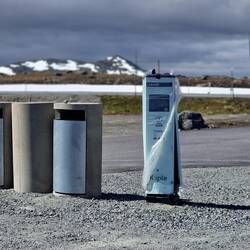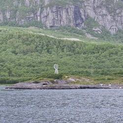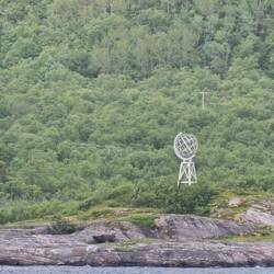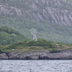 Den Polarkreis nun wieder in südlicher Richtung passiert diesmal auf dem Wasser und der Fähre...trotzdem ist es überall markiert. Hier Mit einer Weltkugel wie am Nordkap.