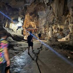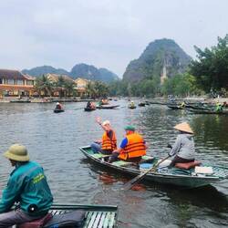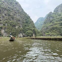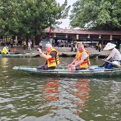Tam croc heißt der Ort, an dem wir zwei Nächte bleiben werden. Das Frühstück ist entspannt und wegen der Touristen annähernd europäisch (Continental).Gut gelaunt geht es zur Bootstour. Zunächst ist der Trubel auf dem Vorplatz zu absolvieren. Die vielen Menschen werden zügig abgefertigt und ca. alle 5 Sekunden verlässt ein Paddelboot mit 2-5 Personen besetzt den Hafen. In einer langen Perlenschnur reihen sich die Boote auf dieser Wasserstraße. Gepaddelt wird mit den Füßen. Es geht durch eine atemberaubende Landschaft mit riesigen Karstfelsen, grünen Reisfeldern und alten Höhlen die durch die Berge führen. Die Tour dauert gute 1,5 Stunden. Neben der weltberühmten Landschaft besteht die Besonderheit darin, dass die BootsführerInnen mit den Füßen die Paddel bedienen. Dafür ist laut Reiseführer ein recht hohes Extra-Trinkgeld nach der Tour fällig. Aber ganz ehrlich: Ich habe noch nie in meinem Leben so schöne, athemberaubende Landschaft gesehen. Nicht zuletzt deshalb wimmelt der Ort von, insbesondere jungen, TouristInnen und Toristen. Es sind auffällig viele europäische BackpackerInnen dabei und natürlich auch einige junge Männer. Die meisten kommen als Tagesausflügler oder für mehrere Tage von Hanoi die 100 km rüber. Während sich die Asiaten mit dem Elektrotaxi die 4 km vom Bahnhof zur Bootsfahrt und zur Pagode kutschieren lassen, nehmen die jungen Mädels aus Europa Fahrräder oder gehen zu Fuß. Die jungen Männer fahren landestypisch mit dem Scooter in der Gegend umher. Ich nehme die 3 km zur Bergpagode Bich Dong zu Fuß auf mich. Es ist ein ganzer Komplex über 3 Etagen, wobei die dritte Etage eine Grotte weit oben ist. In den Bettempeln stehen mehrere Buddha-Statuen als Ausdruck für den stark durch chinesische Einflüsse inspirieren Glauben. Auch wenn einem der Buddhismus fremd ist, so ist man bei diesem Komplex von der Spiritualität und der einfachen Lebensweise der Mönche beeindruckt. Leider haben wir in Vietnam noch keine Mönche gesehen. Dafür treffen wir auf junge Frauen aus Halle, die in 3 Monaten Asien für wenig Geld erkunden wollen (Sri Lanka, Vietnam, Thailand). Die beiden Schwedinnen (kein großes i!) hingegen studieren in Thailand Tourismus.