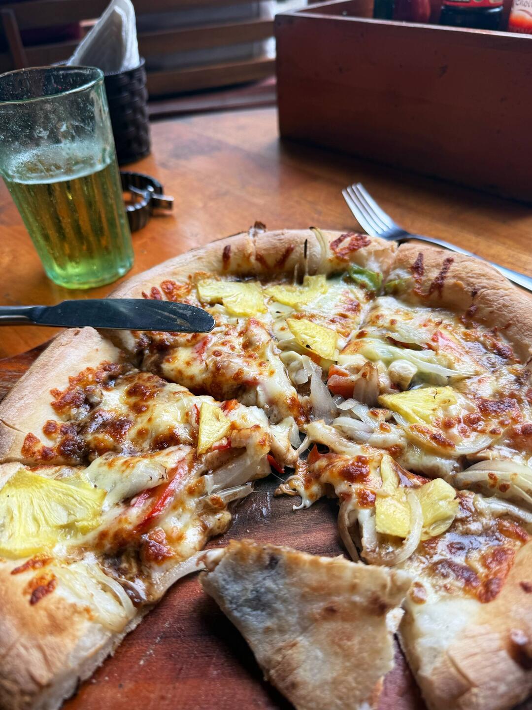 Weil ich mit dem vietnamesischenEssen nicht so richtig klar komme, esse ich im Nachbar-Restaurant eine Pizza Hawaii. Obwohl das Restaurant mit authentisch italienisch wirbt und es sogar Chianti-Wein und einen Holzofen gibt, ist die Pizza ungewöhnlich. Sie ist Amerika Style, statt Tomatenmark wurde Sojasoße verwendet, statt Salami gibt es Hühnerfleisch und die Ananas könnte zahlreicher sein. Das Bier war ok. Selbstredend konnte ich dann bei dem wirklich guten Abendessen nicht so wirklich zulangen. Es gab unter anderem Blumenkohl al dente lau-kalt, Rindfleischstreifen gekocht, Fischstücke frittiert und andere undefinierbaren Köstlichkeiten mit Chilisosse oder süßsauerere Soße.