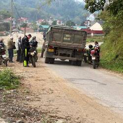 Nur Europäer können so bekloppt sein und Geld dafür bezahlen um solche Straßen fahren zu dürfen! Doch zunächst geht es mit einer Überraschung los: weil heute wenig Regen angesagt ist werden wir einen pass fahren, den wir gestern als Karte beim Abendessen ( übrigens vietnamesisch aber lecker: Kasselerrippchen, Fried chicken, Fried Garnelen, Reis, Suppe) gesehen haben. 82 Spitzkehren auf einer wenig befahrenen Strecke. Auf dem Gipfel der übliche Rummel mit den motorradgruppen und den Kleinbustouristen. Dann biegt der Guide ab. Zwar wird die Straße einspurig und die Betonpiste wird immer schlechter, aber ich komme einigermaßen zurecht. Teilweise geht sie in Geröll und Schlamm über. Erster Höhepunkt hier ist ein ca. 10-15 km Abschnitt, bei dem es zunächst bergauf und dann bergab auf Geröll und Schlamm geht. Ich habe Probleme einem entgegenkommenden Fahrzeug auszuweichen, aber es gelingt irgendwie. Am Nachmittag überqueren wir eine Hängebrücke mit nachfolgendem sehr steilen Anstieg. Prompt bleiben einige in der Mitte vor mir stehen. Ich muss nicht nur im 2. Gang anfahren sondern auch die Steigung bewältigen, weil ich im Moment nicht den ersten Gang reinbekomme. Geht doch!