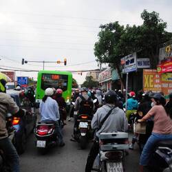 Wir hatten heute mindestens zwei Stürze, einer mit Blessuren und verbogenen Lenker und beim anderen brach ein Hebel ab. Auch hatten wir den Fall, dass zwei Motorräder am rastpunkt einfach vorbeifuhren und später zurückgeholt wurden. Ansonsten verliefen diese 200 km ruhig. Wir merken schnell, dass BaBe am Rande des Speckgürtel von Hanoi liegt. Die Felder (wir sind jetzt langsam im Tiefland und haben kaum Terrassen) sind gut in Schuss. Einmal sehe ich, dass vorgezogener Reis gepflanzt wird, währen 50 km weiter Reis geerntet wird. Auf kleinen Feldern, oft nur auf Beeten, wird Gemüse angebaut. Handwerksbetriebe dominieren in den Ortschaften gegenüber den Händlern. Ein oder zweimal war ich in Versuchung, anzuhalten und ein Foto zu machen. Das ist aber in einer Gruppe schwer.