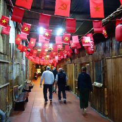 Wir nähern uns dem 17. Breitengrad, der Grenze zwischen Nord- und Südvietnam. Nach dem Pariser Abkommen, bei dem Ho Chi Minh seine Ziele nicht erreichen konnte, war dies eine 10 km breite entmilitarisierte Zone. Beide Seiten hielten sich nicht daran: der Norden schmuggelte Waffen und Amerika bombardierte das zu Nordvietnam gehörende Gebiet. 7 Tonnen Bomben pro Einwohner führten dazu, dass man sich in dem Karstboden ein 2,5 km langes Tunnelsystem baute.