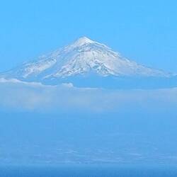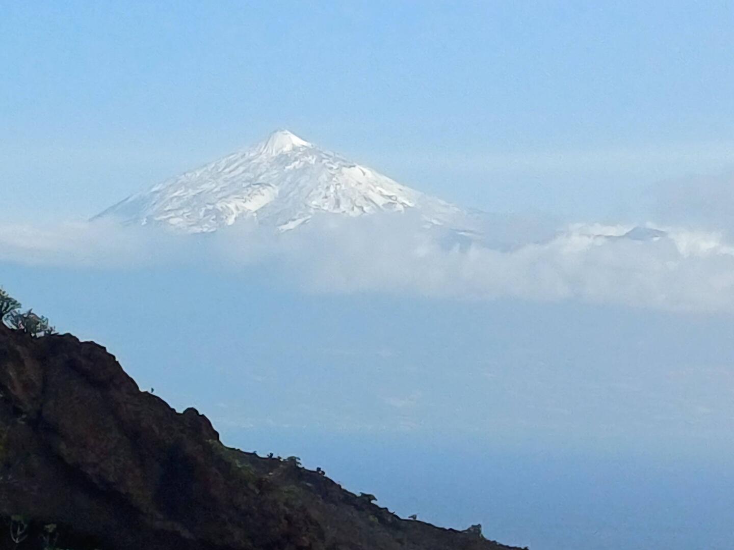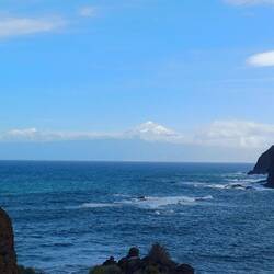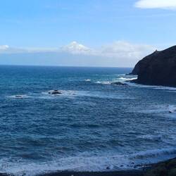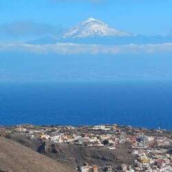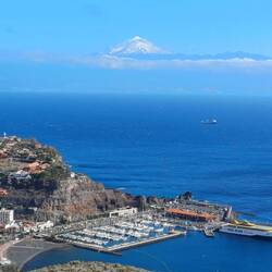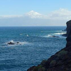 Spektakulärer Ausblick auf die Bucht und den Teide auf Teneriffa, der derzeit satt mit Schnee bedeckt ist.