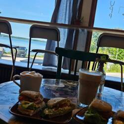 Den Morgencappucino nebst süßer Köstlichkeiten mit Blick aufs Wasser undЧитать далее