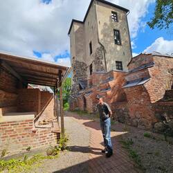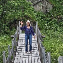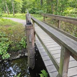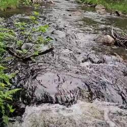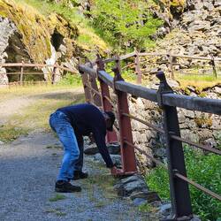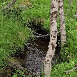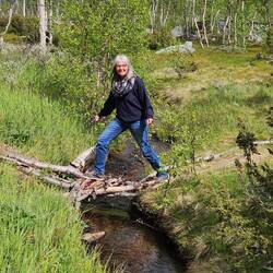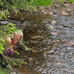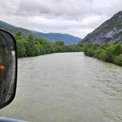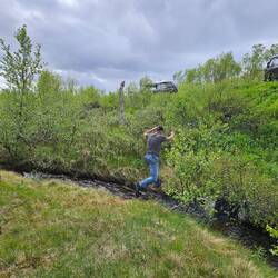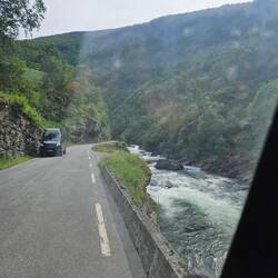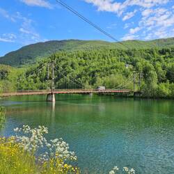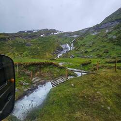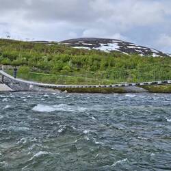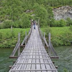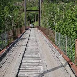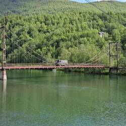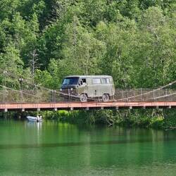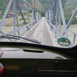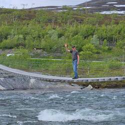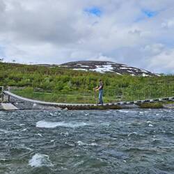 Hier haben wir eine kleine Hängebrücke gefunden, auf der unser Buchanka leider keinen Platz hat. Ob die auch quietscht, konnten wir nicht hören, denn das Wasser war so laut.