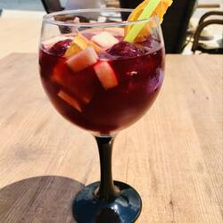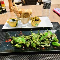 Am Ende der Playa beschließe ich umzukehren. Es ist Zeit für einen kleinen Mittagssnack! Jetzt kommt der Wind entgegen, also geht’s jetzt nur noch mit kleinerem Gang voran ;) Bei einem kleinen Bootshafen sind ein paar Restaurants/Bistros , das sieht nett aus. Am Ende der Mole gefällt mir ein Restaurant aus Naturstein mit Terrasse und Blick aufs Meer. Jetzt darf es auch mal eine Sangria sein, beschließe ich ;) Und dazu gibts Aioli, Oliven, Brot und Pimientos del Padron, alles sieht sehr gut aus und schmeckt auch lecker!
