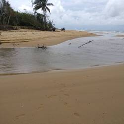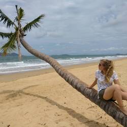 Am nächsten Tag wollten wir Mission Beach erkunden. Wir wollten über den Strand in die Stadt laufen. Der Strand ist wirklich seeeehr lang und nach etwa 30 Minuten (ich kann mich nicht mehr genau an die Zeit erinnern) kamen wir zu einem Fluss der ins Meer floß. Er war wirklich nicht sehr breit aber das Wasser ging mir geschätzt fast bis zu den Oberschenkeln. Normalerweise würde ich einfach durchlaufen da wir schon Badesachen anhatten. Da wir aber in Australien sind, hatte ich dann doch ein wenig Angst von einem Krokodil überrascht zu werden :-D. Nach langer Zeit ohne Menschen kam uns ein einheimischer entgegen, lachte und lief einfach durch das Wasser :-D.