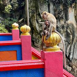 Vom Bahnhof bin ich für gerade mal 1 EUR hin und zurück mit dem Zug zu den Batu Caves gefahren. Nach ca. 20 Minuten entspannter Fahrt war ich dort, bin auf dem Zug gestiegen und noch ungefähr 5 Minuten zu den Tempeln gelaufen. Auf dem Weg dorthin findet man viele kleine Verkaufsstände und kleine Tempel. Begleitet wird man dann von Affen :-D.