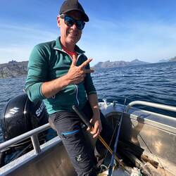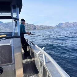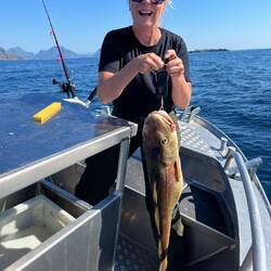 Wir fahren wieder raus. Und heute ist Torsk ( Dorsch ) Tag. Mein erster Biss ist gewaltig und nimmt Schnur ohne Ende. Und dann kommen 2 Dorsche hoch. Einer ist 95 cm lang und wiegt 18 kg und derLæs mere
