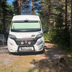 Wir werden von heftigem Regen und Gewitter geweckt. Aus diesem Grund verlassen wir Vännäs Camping so schnell als möglich und frühstücken unterwegs. Wir fahren heute wieder 6,5 Stunden ( inklusiveLæs mere