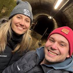 Angezogen und ausgerüstet, inklusive einer ausgeliehenen Heizweste von Sabrina und Marius (man muss sie halt auch einstecken, damit sie funktioniert 😉), machen wir uns auf den Weg zum Bremsberg. Ein paar Treppenstufen hinunter, dann beginnt das Wasser. Hier tauchen wir ab.