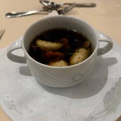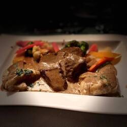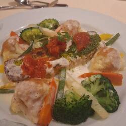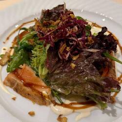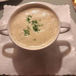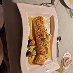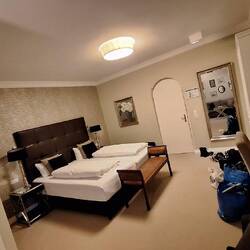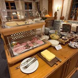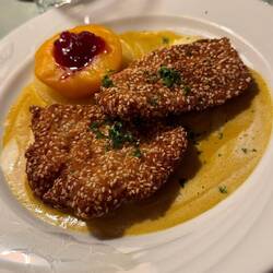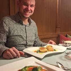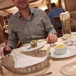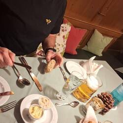 Um 18.30 Uhr geht es zum Abendessen, dank Halbpension einfach eine Etage tiefer ins Restaurant. Wir werden mit einem Drei-Gänge-Menü verwöhnt. Bei Manuel wissen wir nicht genau, wie viel Gans in allem war, wir nennen es einfach Schnitzel mit Kräuterbutter. 🦆😅 Aber es war alles sehr, sehr lecker.