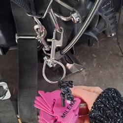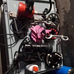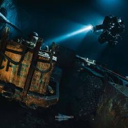 Eine Stage Flasche fällt direkt weg, da es bei der ersten Stufe abgeblasen hat. 🥸 Das Problem vertagen wir, jetzt steht erst einmal ein Checkdive an. Wir tauchen den 120 Meter langen Bremsberg hinunter, setzen unsere neu extra angefertigten Cookies aus dem 3D-Drucker an die Leine und biegen links in den Maschinenraum ab. Wow! Was für ein Gefühl.