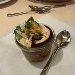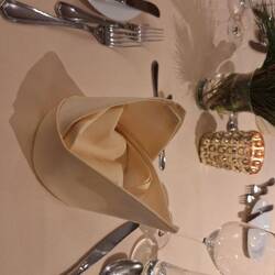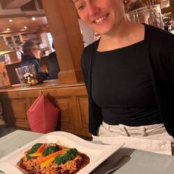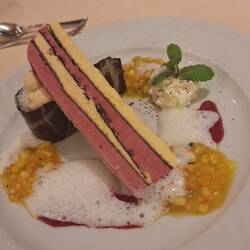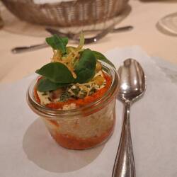 Das Silvestermenü ist hervorragend, einfach grandios. Ein Fünf-Gänge-Menü mit besonderen Spezialitäten: aus dem Sauerland, ein sehr leckeres Amisbusch, feiner Apérol- und Winterspritz. Manuels Roastbeef ist hervorragend, und auch meine vegetarische Polenta ist ein echtes Highlight.