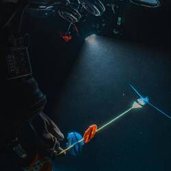 Manuel hat zwei Lampen dabei, die ihm früher selbst gehört haben, die er verkauft hat und sich nun ausgeliehen hat. Diese befestigt er an Auftriebskörpern. Die Lampen werden nun so jeweils an der Decke positioniert. Durch den Auftrieb schweben die Lampen frei und funktionieren so fast wie richtige Scheinwerfer.