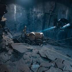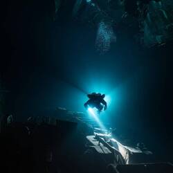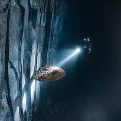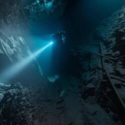 Wir tauchen die rechte Seite des Bergwerks und erreichen nach insgesamt 17 Minuten Tauchzeit die Sprengstoffkammer. Dort platzieren wir ein Licht im Raum und setzen vier weitere Lichter an der Decke.