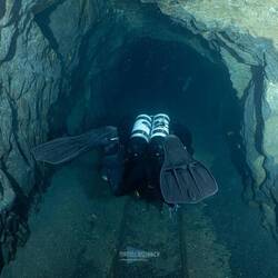 Danach bleibt uns noch etwas Zeit, um auf die andere Seite zu tauchen und kurz vor der Tür zur Sprengstoffkammer ein, zwei weitere Bilder zu machen. Dann geht es langsam zurück. Den Bremsberg tauchen wir sehr kontrolliert wieder hinauf, damit die Dekompression sauber ablaufen kann. Bei einer maximalen Tiefe von 32 Metern haben wir insgesamt 16 Minuten Deko gesammelt.