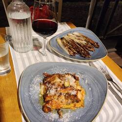 I went to Mr Cloods in Trastevere for dinner, a suggestion from a friend. On the way there passed by live music after live music. Is tucked down a tiny scary dark alleyway but definitely did not disappoint. I ordered lasagna with wine and a side of charred raddaccio and it was probably the best Roman meal I've had so far.Les mer