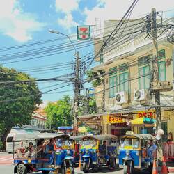 Nach mehr als 1000 Kilometern allein in Thailand erreichen wir die Zielgerade nach Bangkok - in Form einer Vorstadtautobahn, welche die letzten 100 Kilometer in die Stadt hinein führt. 70 Kilometer vor Bangkok machen wir einen Abstecher nach Samut Songkhram, mit dem berühmten Mae Klong Markt. Südostasiatische Märkte sind wegen ihres vielfältigen Angebots an bunten Tropen- und Meeresfrüchten über Streetfood-Snacks bis hin zu Plastikgeschirr und Schrauben ohnehin sehenswert. Dieser Markt ist zusätzlich dafür bekannt, dass er sich direkt an, oder besser auf, Bahngleisen befindet. Acht Mal am Tag packen die Händler:innen daher routiniert ihre Stände und Markisen zusammen und werden dabei von einer Horde Tagestourist:innen beobachtet, die extra aus Bangkok angereist sind, um das zweiminütige Spektakel zu bewundern, wenn sich der Zug im Schritttempo durch den Markt schiebt.