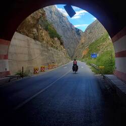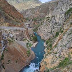Schon das erste Flusstal ist mit seinen fast Eintausend Meter hohen Hängen beeindruckend. Spätestens beim zweiten wird die Landschaft aber absolut spektakulär: Das Tal verengt sich zu einem einsamen Canyon, dessen grandiose Gesteinsformen in verschiedenen roten Farbtönen leuchten. Die Straße ist mit einigen Tunneln und Brücken kunstvoll angelegt und bleibt trotz des widrigen Terrains ziemlich flach. Kerben in der Fahrbahn zeugen von regelmäßigen Steinschlägen und Lawinen, die aber offenbar zügig geräumt werden.