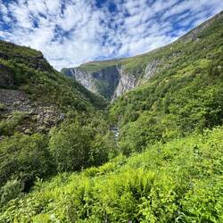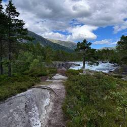 Oben in Østerbø angekommen, machen sich viele andere Wanderer mit uns auf dem Weg hinab nach Vassbygdi. Wir lassen alle vorbei, so dass wir bald schon fast alleine auf dem Wanderweg sind. Da die meisten, so wie wir, bergab laufen, kommen uns nur einige wenige entgegen (und das auch erst nach ein paar Stunden) und von hinten kommt bald niemand mehr, da an diesem Tag nur ein einziger Bus nach Østerbø fährt.