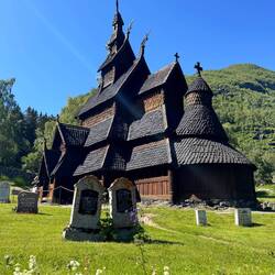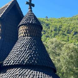 Die Stabkirche in Borgund wurde mit Pech bestrichen und macht daher einen besonders interessanten Eindruck. Abgesehen davon sieht sie mit ihren mehreren Ebenen und Rundungen sowieso schickikowski aus. Nach innen gehen wir nicht, denn Hunde müssen draußen warten und es ist heute echt heiß.