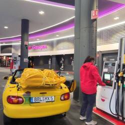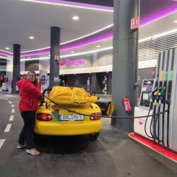 Einmal volltanken am dieser coolen Tankstelle. Zwar deutlich teurer als die nachfolgenden Tankstellen, dafür konnte Susi bei guter Musik und Beleuchtung eine kleine Tanzeinlage starten.