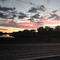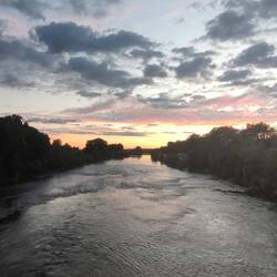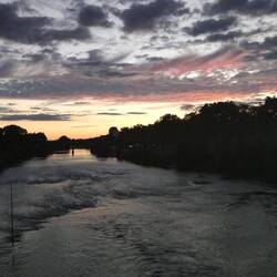 Wir genießen den wunderschönen Sonnenuntergang auf Empfehlung unseres Gastgebers am Fluss. Sehr geil!