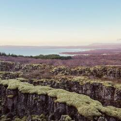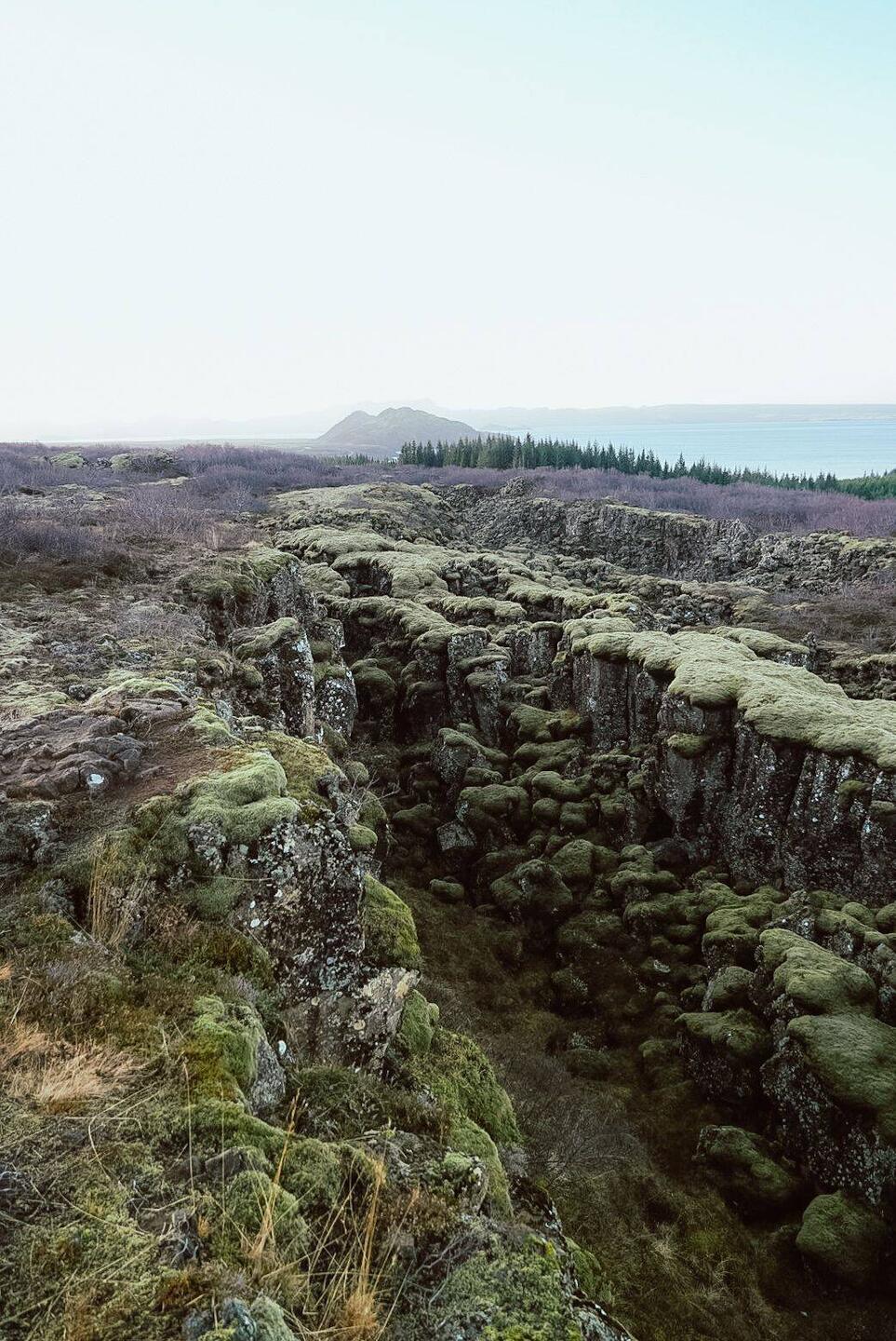 Zerklüftete Landschaften, aber mit Moos bewachsen. In der Ferne Berge und Seen.
