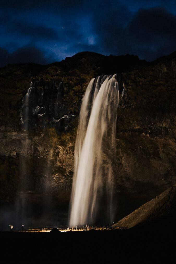 Seljalandsfoss Wasserfall im Dunkeln