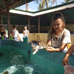 Als wir sie vormittags besuchten, waren gerade junge Volontäre aus den USA, Kanada, Deutschland....dabei die Becken zu putzen, neues Salzwasser einzulassen, die Schildkröten verschiedenen Alters in eine extra Schüssel zu setzen und zu füttern. Von ihnen erfuhren wir auch, dass die Schildkröten im.Alter von neun bis zehn Monaten von der Station ins Meer gebracht werden....jeden Freitag. In diesem Alter sind sie ca.30 bis 40 cm groß. Die größeren Schildkröten sind in der Regel auch allein in einem Becken, da sie sich mit einem Mitbewohner im Becken bekämpfen würden....echt spannend und schön.