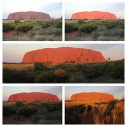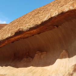 Der Uluru ist nicht einfach nur ein roter Berg in einer sonst ebenen Landschaft.....es finden sich verschiedene Höhlen im Berg, zum Teil sehen sie aus, wie durch Wellen ausgewaschen, riesige Gesteinsbrocken liegen überall herum, es gibt Spalten im Berg die einmal vertikal den ganzen Berg hinunterlaufen, an anderen Stellen hat der Berg schwarze Streifen, als wenn da seit Tausenden von Jahren immer wieder Wasser den Berg hinunter geflossen ist, diesen aber nicht ausgehöhlt hat....Und wenn man den Uluru aus der Ferne betrachtet, so kann man bei den verschiedenen Formationen seiner Fantasie freien Lauf lassen....so gibt es dort schon einige Namensgebungen, wie eine Languste, Harry Potter, einen Elefantenkopf mit Rüssel, ein Gehirn, Mick Jaggers Lippe....