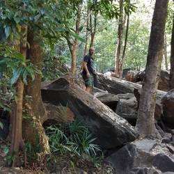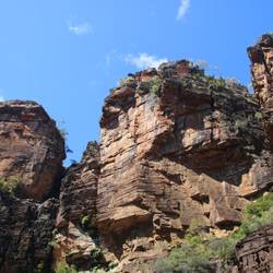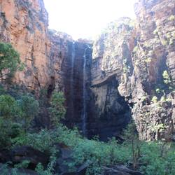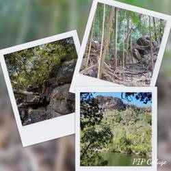 Um zu den Jim Jim Falls zu kommen, muss man laut Angaben auf einer Tafel noch 900 Meter gehen....und wir haben von gestern gelernt, als wir mit Flip Flops im Gebirge auf den Sandsteinformationen herumkletterten....Treckingschuhe an und los ging es, zuerst zum Creek (Bach) mit leeren Krokodilfallen und einem Blick zum Wasserfalll...... und dann weiter Richtung Wasserfall....wir kletterten kreuz und quer über riesige Steine und hangelten uns schmale Wege entlang....als Schweizer kannte Marc so etwas sehr gut....für mich, als Flachlandtiroler, war es an einigen Stellen schon eine Herausforderung....aber Aufgeben war keine Option...und dann hatten wir den Blick auf den ca. 200 Meter hohen Wasserfall....Irgendwie hatten wir gedacht, dass da mehr Wasser den Berg runterfällt, aber es ist Trockenzeit.😏 Direkt bis zum Pool des Wasserfalls sind wir denn doch nicht mehr geklettert, da der Weg über die Steine nun schon sehr beschwerlich und auch glitschig wurde und wir zum anderen auch nicht im Pool baden wollten, da die Sache mit den Salzwasser- als auch Süßwasserkrokodilen uns nicht so geheuer ist.