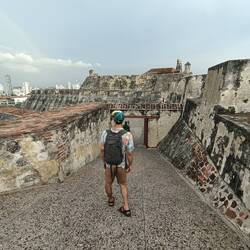 Nouvelle journée à Cartagena. Réveil 6heures du matin, pour échapper un peu à la chaleur accablante. Échec de la stratégie. A 7h il fait déjà 40 degré ressenti ! Nous comprenons vite que la seule parade efficace au soleil consiste à se réfugier régulièrement dans des espaces climatisés, attendre que la température corporelle redescende à un niveau acceptable, puis ressortir dans la fournaise, et ainsi de suite. Visite du Palacio de la Inquisition, toujours en nage. A 12h, vaincus, ou plutôt fondus, nous retournons à notre logement pour y passer les heures les plus chaudes. On en profite pour transformer la chambre en buanderie avec nos vêtements mis à sécher et pendus un peu partout. Puis nous sortons de nouveau en fin d'après-midi, direction le Castillo de San Felipe, énorme fort dominant la ville de toute sa masse. A son sommet, un grand drapeau Colombien claque sous le vent. Promesse de fraicheur.