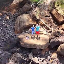 Doch dann überraschte uns der Regen und wir sind klitscheklatsche nass geworden! Tobi hat es ein wenig aufgenommen, an der Küste mit den rutschignassen Steinen, war es zu gefährlich, da wurde allesLeer más