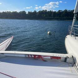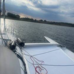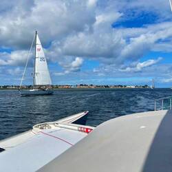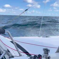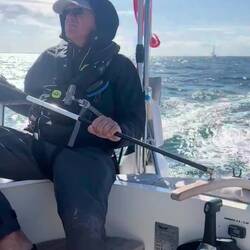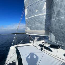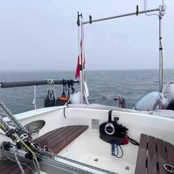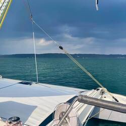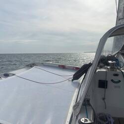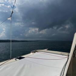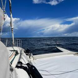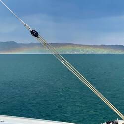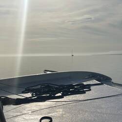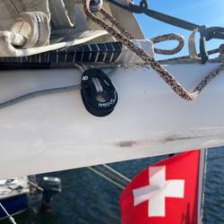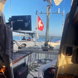Da der Wind dort nachliess, setzte ich den Code 0 und kreuzte am Wind auf. In einer Bö gab es einen lauten Knall und der Code 0 begann wie wild zu schlagen. Der Niederholer des Genakerbaums hatte den Geist aufgegeben! Also Autopilot eingeschaltet und nach vorne zum Bergen des wildgewordenen Segels.