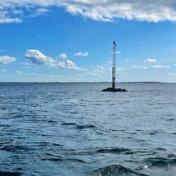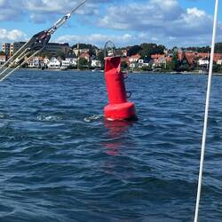 Trotzdem beschloss ich, durchzubeissen und weiter aufzukreuzen. Im Windschatten von Romsø wurde es dann mit den Wellen besser und ich konnte bis zu der geplanten Boje durchfahren. Trotz starkem Wind lag ich gut an der Boje, da das Wasser total flach war.