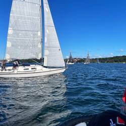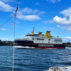 Die Ausfahrt im Svendborgsund gen Osten wurde gerade zur Belastungsprobe. Der Furler hatte wieder mal einen Überläufer und die Genua liess sich nicht mehr ein- oder ausrollen. Zugleich kam uns noch ein ganzes Regattafeld entgegen, welches mit Vorfahrt natürlich das ganze Fahrwasser für sich reklamierte. Antonio war am Steuer gefordert, ich vorne mit dem Kopf und Oberkörper im Ankerkasten an der Trommel.