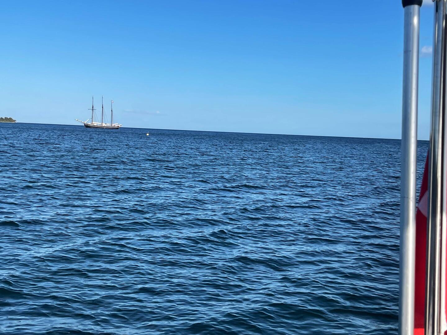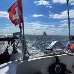 Dank einem angenehmen Westwind konnten wir nach der Brücke von Lübeck das Gross setzen und mit dem gesetzten Kegel mit Motorunterstützung mit rund 7 Knoten aufkreuzen. Wir bekamen Geleitschutz von zwei Polizeibooten, die uns bis Höhe Travemünde begleiteten. Da wir mit Motor und Segel gleich schnell waren wie sie, gab es ein Rally. Offenbar hatten sie an uns Nichts auszusetzen. Trotz mehrmaligen kritischen Blicken kontrollierten sie uns nicht.