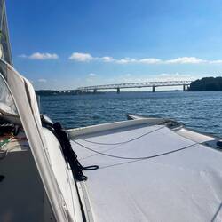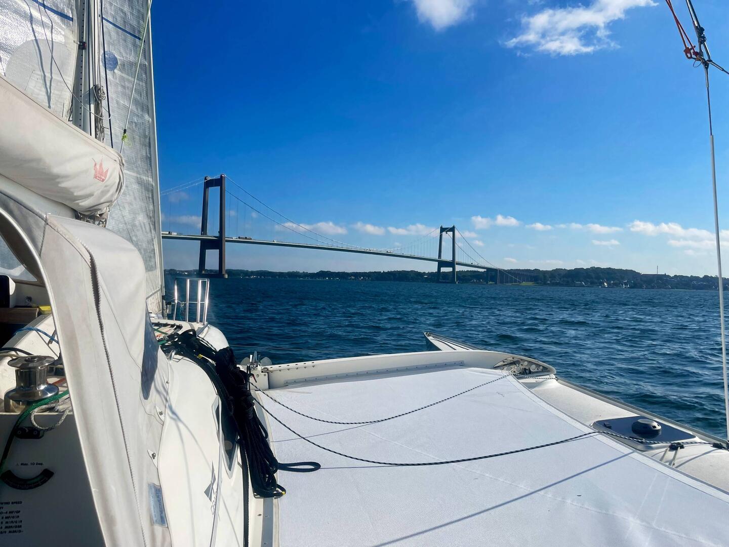 Die Fahrt durch den kleinen Belt war dann zu Beginn spannend. Mit anderen Booten gab es eine kleine Regatta durch die Windungen. Da der Wind raum war und ich wegen dem defekten Niederholer des Genakerbaums kein Leichtwindsegel aufziehen konnte, trickste ich zwischen den beiden Brücken.