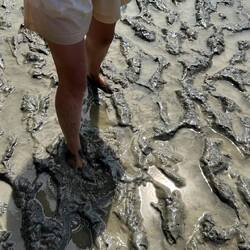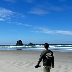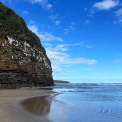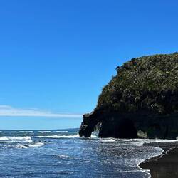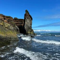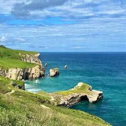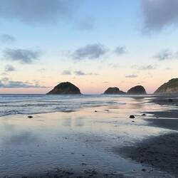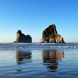 Heute Früh ging es weiter in Richtung Westen oder wie wir sagen, nach links. Die Strecke nach links war landschaftlich schon ein erstes Highlight. Auf dem Weg nach New Plymouth (unglücklicher Name für meine mittlere „th“ Aussprache) wollten wir uns noch einen berühmten Strand mit den Three Sisters and the Elephant Rock (alles Felsen im Wasser) ansehen. Mal wieder völlig unvorbereitet haben wir dann vor Ort erfahren, dass man nur während Ebbe und auch darin nur innerhalb zwei Stunden zum Strand gelangt. Wir werden hier viel zu oft mit diesen Gezeiten konfrontiert, die wir trotz diverser Lehrvideos noch nicht ganz kapiert haben. Das Glück ist aber anscheinend tatsächlich mit den Dummen und so mussten wir nur 15 Minuten warten, bis wir im Knie hohen Wasser zum Strand laufen konnten. Ganz so easy war das gar nicht durch einen Mix aus tiefem Schlamm und schmerzhaften Steinen, die man im Wasser meist zu spät sehen konnte. Aber wir kamen nach kurzem Kampf an und konnten den traumhaften Ausblick genießen.