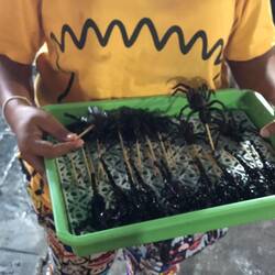 Weiter ging es Richtung „Khao San Road“. Jeder kennt wahrscheinlich diese besonders belebten Straßen in anderen Großstädten, in denen es vor Händlern, Bars, Clubs und was Touristen eben noch so anzieht, nur so wimmelt. In dieser Straße gaben sich die Einheimischen allerdings besonders Mühe, ihrem Ruf für Exotisches gerecht zu werden. Überall gab es, neben dem üblichem einheimischem Essen, allerlei „Besondere Leckereien“ wie Spinnen, Skorpione, Maden, Schmetterlingskokons und Krokodil. Das Krokodil wurde natürlich, üblich wie bei uns das Spanferkel, im Ganzen am Spieß präsentiert.