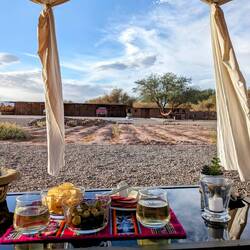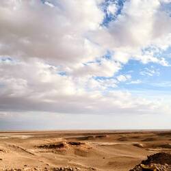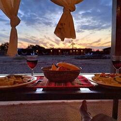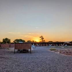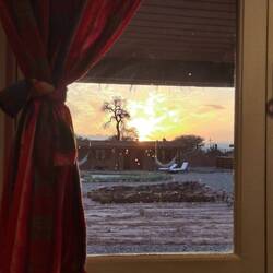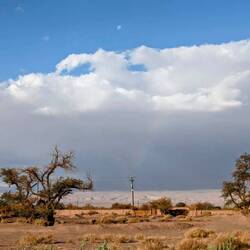 Der erste richtige Tag in dieser Wüstenumgebung. Aufwachen und es ist warm? Herrlich. Und dann guckt man raus und sieht dieses fantastischen blauen Himmel und überall diese Bergkette.