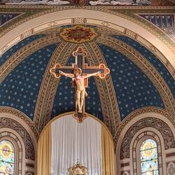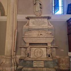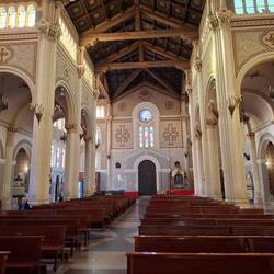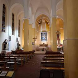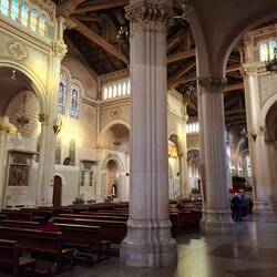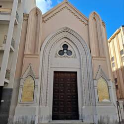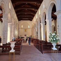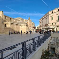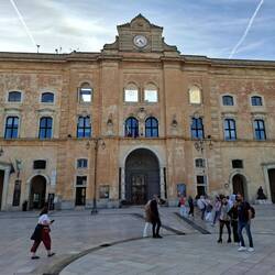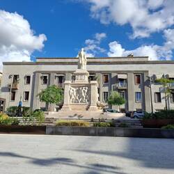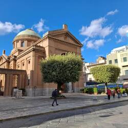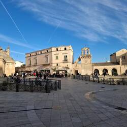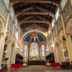"An der Piazza Duomo erhebt sich die 1928 geweihte neoromanische Kathedrale. Die breite Fassade ist mit vier schlanken Türmen, einem Giebel, einer Fensterrose, Säulenarkaden und ornamentierten Profilbändern geschmückt." Quelle ADAC Maps