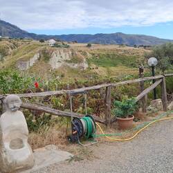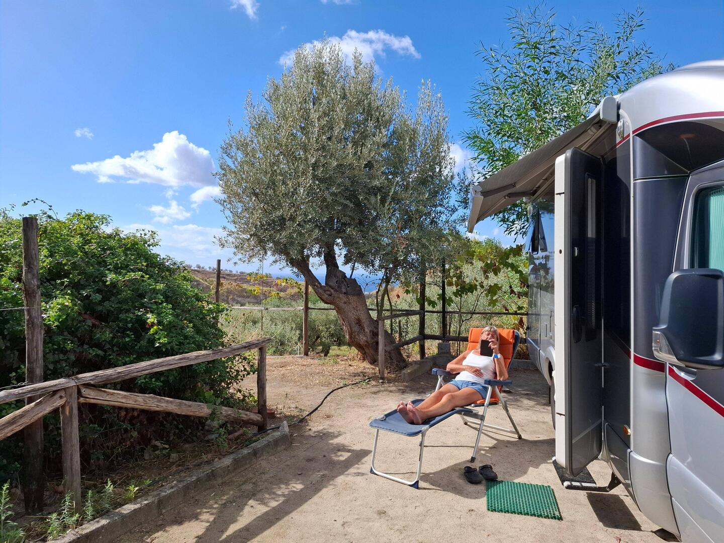 Ab Reggio Calabria schlängelte sich ein Sträßchen zum Agriturismo Rudì rauf. Wir hatten schon des öfteren nach Agriturismo geschaut, oft mit überzogenen Stellplatzgebühren und teuren Menüs. Hier kostet der Stellplatz 20 Euro plus 3 Euro Taxe, auf die 4 Euro für Strom haben wir verzichtet. Nach den euphorischen Bewertungen in park4night ist der erste Eindruck zurückhaltend, was sich allerdings später neutralisiert hat. Passt schon... 😉