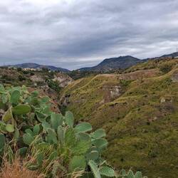 Bis zur mautfreien Autobahn die Peastum Ausgrabungsstätte umfahren, dann nach etwa 90 Kilometern runter von der Autobahn und etwa 45 Kilometer durch eine wunderschöne Berglandschaft. Das konnten auch die vielen Wolken, einschließlich eines kurzen Regenschauers, nicht vermiesen. Die kurvige, aber gut ausgebaute Landstraße ließ sich angenehm fahren. Kalabrien hat uns begrüßt.