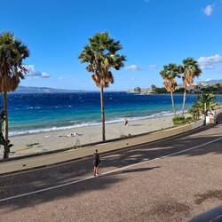 Die Haltestelle für den Bus nach Reggio Calabria ist nur rund 600 m vom Agricamping entfernt. Der Bus war fahrplanmäßig pünktlich, Geld gezeigt, ein knappes "No" vom Fahrer... In der Stadt stieg ein Kontrolleur zu, was passiert jetzt? Der Busfahrer kommunizierte mit dem Kontrolleur, freundlich wurden je 2 Euro für die Fahrscheine kassiert. Alles gut... 😉