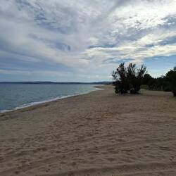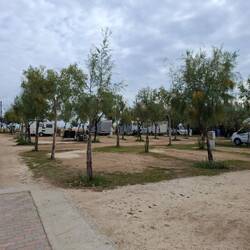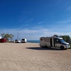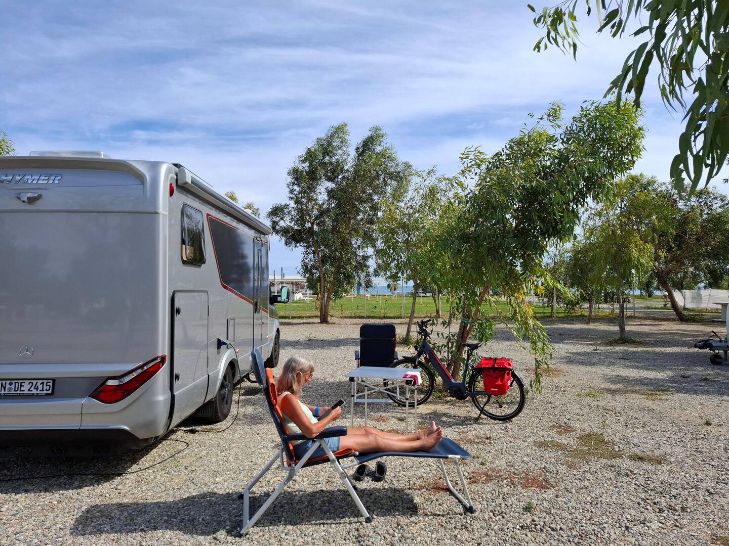 Riesiger Campingstellplatz, vielleicht zu 10% ausgelastet. 15 Euro mit Strom in der Nachsaison, 50 m zum weitläufigen grauen Strand.