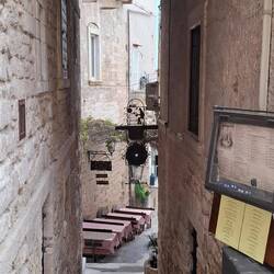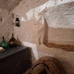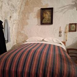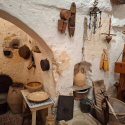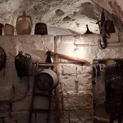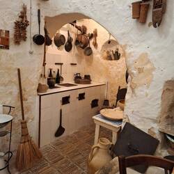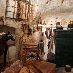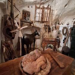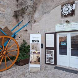 Um die Gebräuche und Sitten der Einwohner der "Sassi", des alten bis zu der ersten Hälfte des 20. Jahrhunderts bewohnten Stadt teils von Matera, besser zu verstehen, besuchen Sie im vico Solitario (Sasso Caveoso) eine typisch eingerichtete Felsenwohnung mit Möbelstücken und Werkzeugen aus jener Zeit." Beschreibung von einer Tafel